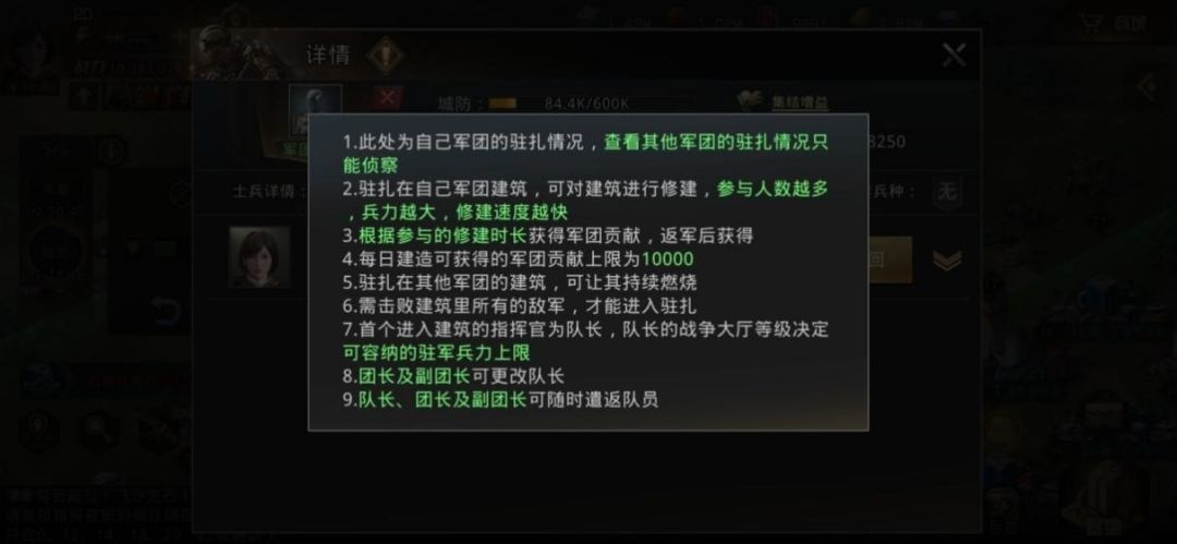 ①军团贡献:可以通过建设军团分部来获得,每天贡献上限一万。获得的贡献值是根据你参与的修建时长计算贡献值,兵越多建的越快。反之则是兵越少,建得越慢时间就越久。建设时可以只派个巨兽建设。