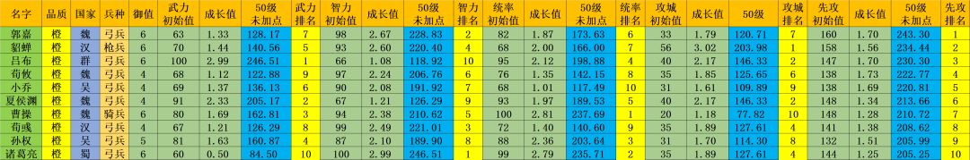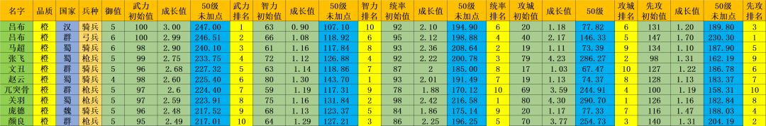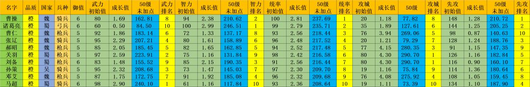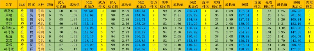 才出的诸葛亮武力排名NO.125(橙、紫总排名),智力排名NO.1(之前是周瑜NO.1),统率排名NO.2(仅次于曹操的NO.1),先攻排名NO.10,攻城排名NO.57。