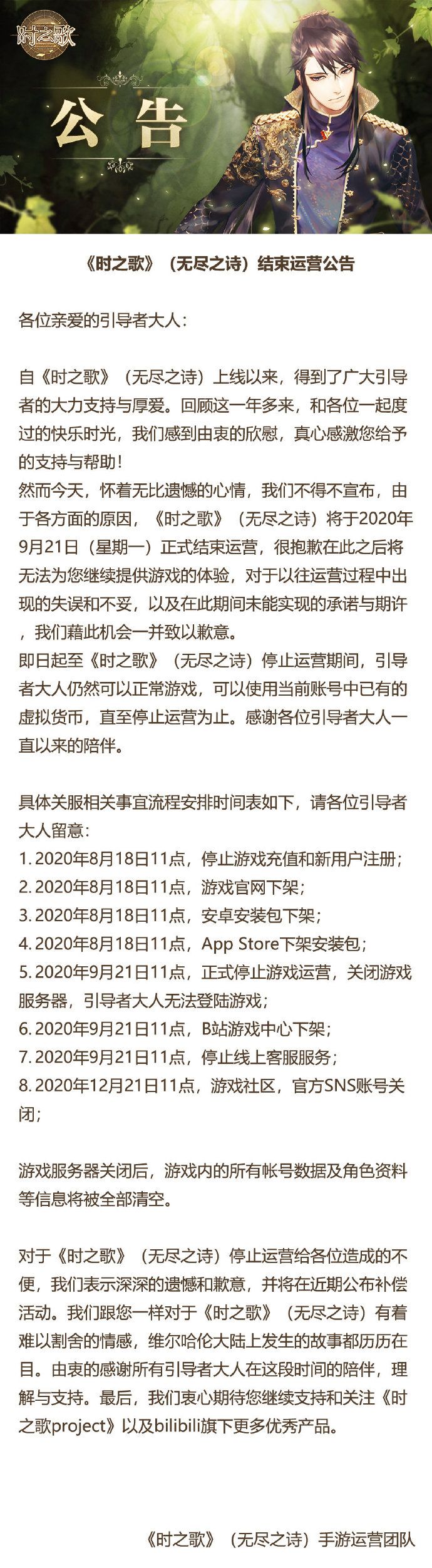 然而今天,怀着无比遗憾的心情,我们不得不宣布,由于各方面的原因,《时之歌》(无尽之诗)将于2020年9月21日(星期一)正式结束运营,很抱歉在此之后将无法为您继续提供游戏的体验,对于以往运营过程中出现的失误和不妥,以及在此期间未能实现的承诺与期许,我们藉此机会一并致以歉意。