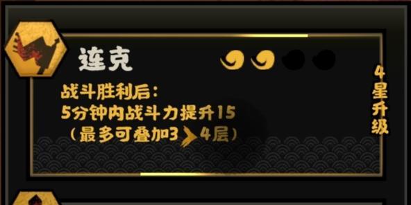 连克:战斗胜利后5分钟内战斗力提高15,初始最高叠加两层