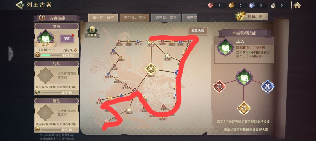 下面的阶段就是无趣的,刷战功,抢车,换资源,升主城,当一队主将22级时就可以打八级地,打枪兵,关羽用弓兵,打这个八级地是推任务的,缺什么打什么,然后就刷战功,顺手抢车,在第一天把主城升至八级会开启竞技协会,打十次,一般都会是十连胜,竞技祈愿获得刻印石,然后就可以去列王古卷点技能,把丰收技能点出来,像我这样点