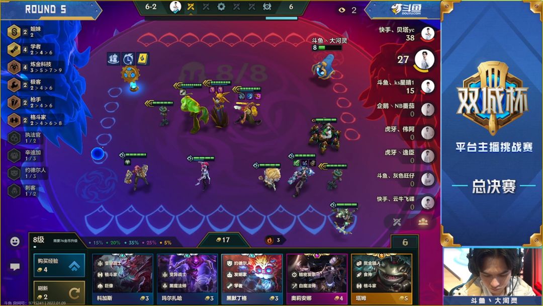 最后就是大河灵提节奏的果断,当外面低费阵容,大嘴也刚好同时成型的时候,大河灵和大嘴不约而同的同时提节奏,都想去断一下对方的节奏,这点就是兔子要说的,因为拼多多老鼠这套阵容,如果拿不到发明家转职,那么钱是会溢出的,所以在我们体系卡基本三星后一定不要卡着利息去上人口,尽量的提节奏,抢人口,同时断一下外面的节奏。