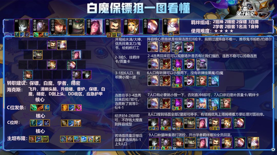 另外整场比赛最经典的地方就在于前期装备选择以及阵容定向,前期星晴和灰色旺仔的处理方式基本相同,依靠三约+保镖转职+青龙刀/羊刀这样的组合来摇摆阵容,装备方面优先喂发条找装备,后面野怪多余的输出装养烬,最后就是决赛圈2家之间的博弈,第一波灰色旺仔的食人塔姆吃掉了星晴的单点前排布隆,随后灰色旺仔的前排向前压制,这样一来,灰色旺仔的发条能直接控到星晴的后排,第一波星晴输掉,第二波星晴就很聪明,知道自己前排不能被吃,所以让自己一星塔姆去吃灰色旺仔的2星塔姆,这样一来首先能延缓灰色旺仔塔姆的吞前排效率,同时也能等到己方其余前排将布隆保护起来,这也是整场比赛最为亮眼的操作,当然还有最值得学习的地方就是两家都是拿了保镖转职,无论对重秘还是白魔狙来讲,保镖转职对8人口提升都是不容小觑的,因为有了保镖转职,8人口能开出4保镖,不用挂废卡,否则强开4保镖是有1张波比/诺手是废卡的,这也是这套阵容最为核心的提升点,兄弟们可以消化一下这套思路,这样无论玩白魔狙还是重秘发条,中间过渡都是用得上的呀!