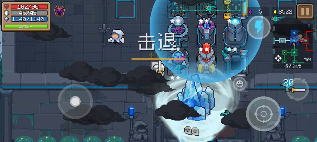 可以生成一个抵挡子弹的护盾,但是无法抵挡激光,护盾值会以白色能量条形式体现在炮塔血条上方,防御范围随品质提高,护盾值随品质和等级提高,最大可以覆盖门口那个九宫格。