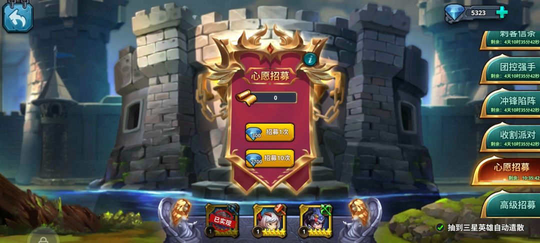 第4天有心愿抽然推荐首选迦罗,后面可以看自己手上有什么卡,只要是上面t0表里的可以升星的情况下都可以选择,(尽量五个系都养一个这样才不会卡等级)注意在不确定要养这个英雄的情况不要升星超过8星。因为8星升9星要一个8星材料 所以前期随便升星都是没问题的。