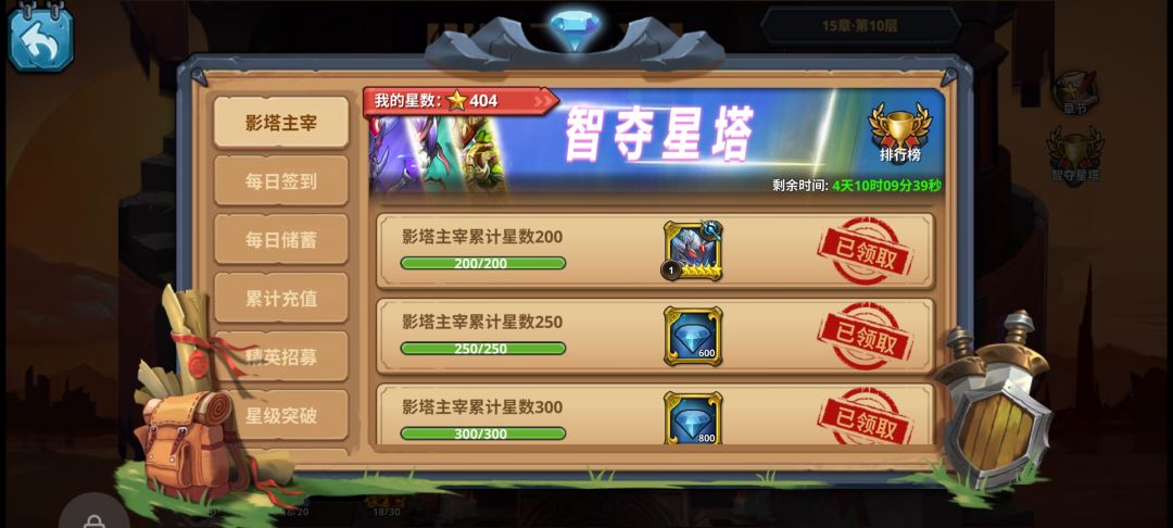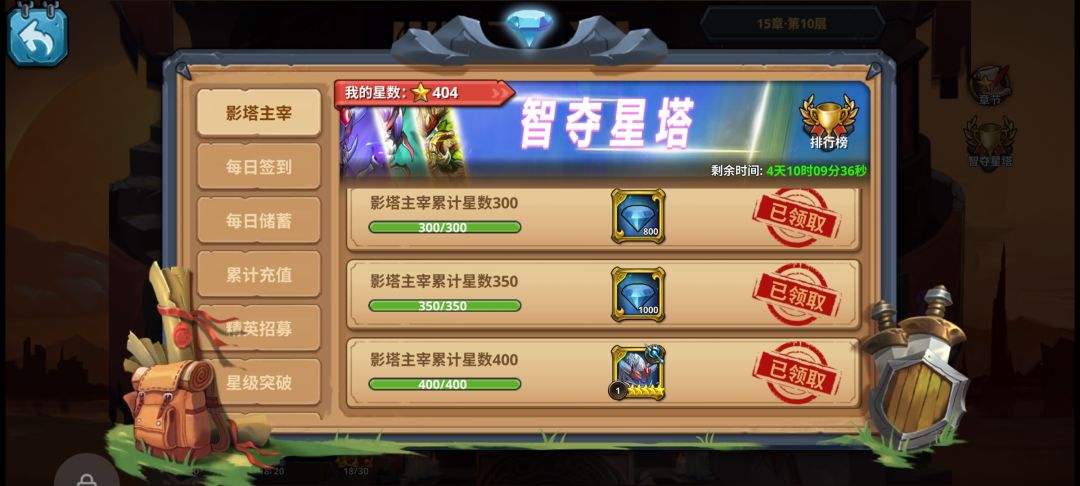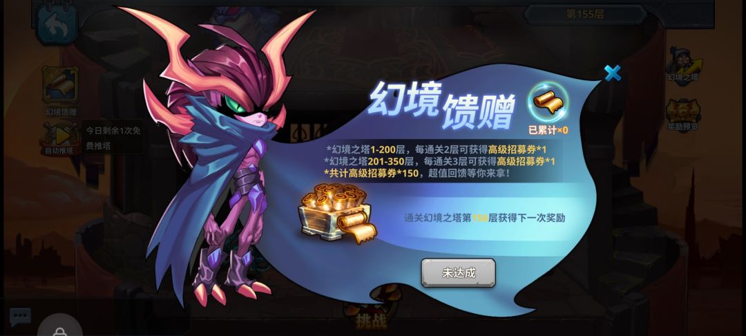 爬塔是获取资源的主要途径打不过的关卡推荐手动打,其实很多关手动就能打过了这个有点肝但是资源非常好甚至400星可以领取到两个迦罗其中还有大量招募卷以及角色
