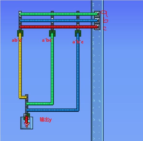 a':表示项a的取反,也表示项a通过非门输出,也可以写作¬a或者!或者a上划线(我打不出来你们自行想象吧)在泰拉瑞亚中,我们可以通过单次信号的激活来取反