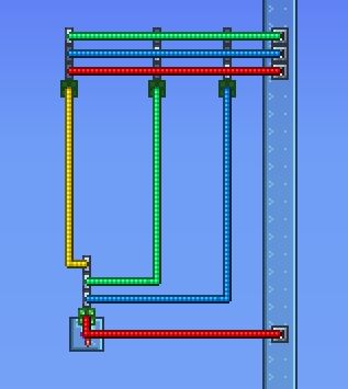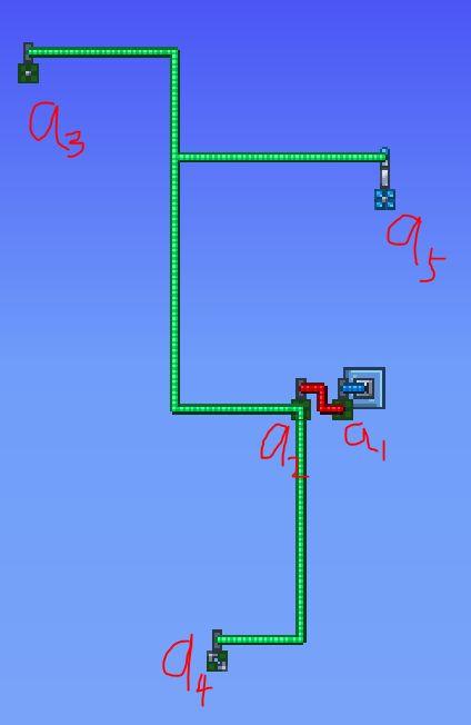 在泰拉瑞亚中,逻辑门发出信号看似没有延迟,全部在一物理帧内完成,但逻辑门确实有其运算顺序,我们可以通过以下电路来证明: