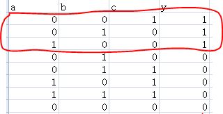 这里我们仍以y=a'b'c+a'bc'+ab'c'为例,真值表如下