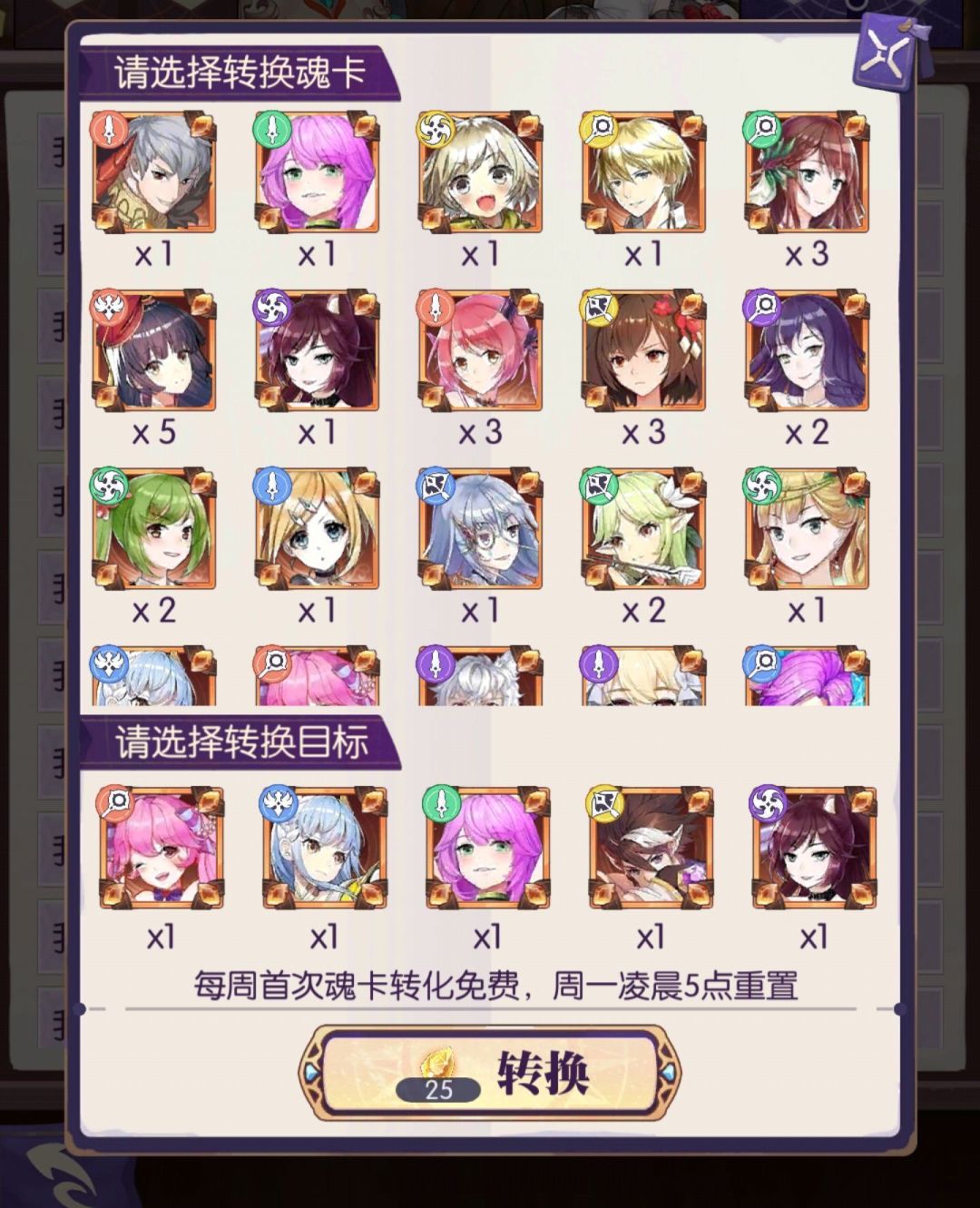万事屋可以转换狗粮,每周第一次免费,后面一次25神晶,是这个游戏特定狗粮最主要的来源,可将任意橙+卡转换为五种基础狗粮之一,入口→我想利用多余的【魂卡】