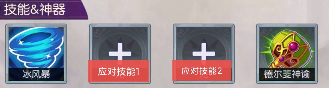 应对技能各位都经历过,就是R2期,BOSS释放技能时,头上会冒出技能图标,那个就是应对技能,目前主流的推图技能为 冰风暴+两个应对技能(如下图)