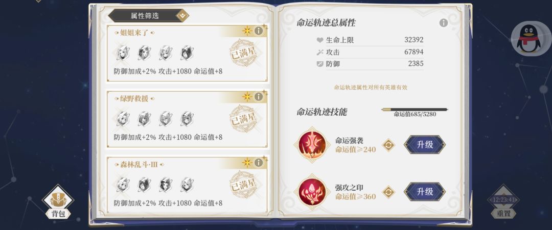 我的命运盛典主要是以提高基础面板为前提,其中我个人觉得目前的情况攻击力的收益比较高,目前不论推图还是竞技场,都需要攻击力的加持,特别是竞技场,大家的输出都很爆炸,如果选择提高防御和生命上限(元素队除外,元素对于防御和生命加成的需求很多时候会高于攻击力),在你星石不足命运总值不高的情况下,会造成别人该杀你还是杀你你撑不住,反而本该换掉的敌人却因为伤害不足换不掉。