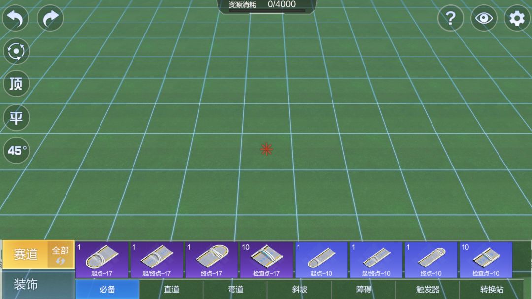 左边的按键主要是调整视角的,我一般都是开的45°,左上角的是撤销和恢复按钮,比如你在创建赛道的时候一不小心放错位置了但又不好点,这个时候这两个按钮就起作用了,反手给他点下撤销,就恢复上一步操作了。最下面一排的是创建赛道的材料: