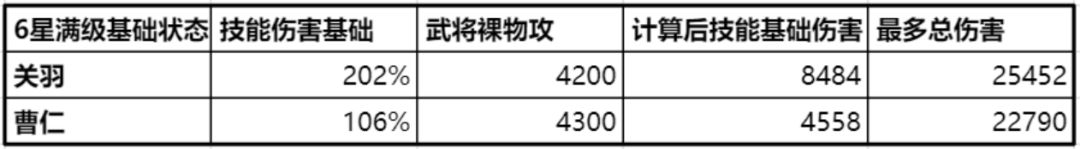 在同等星级与等级下,曹仁物攻基础为4300,关羽为4200。六星关羽能造成202%的物理伤害,基础状态下算下来就是8484的物理伤害。