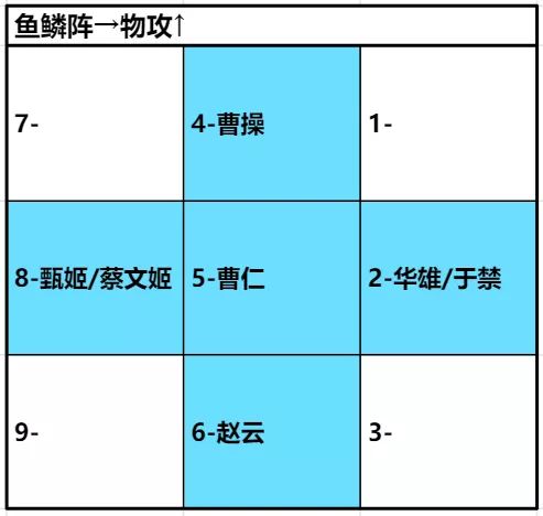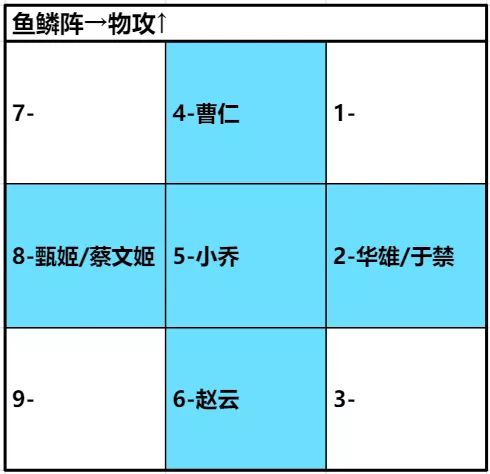 思路:利用华雄的抗伤能力,减少己方前排受到的伤害,作为主力输出的赵云受到的攻击多,士气循环快,打出的伤害能更高。曹仁在队内负责补足全体伤害,同时降低敌方士气,让对手无法打满输出。