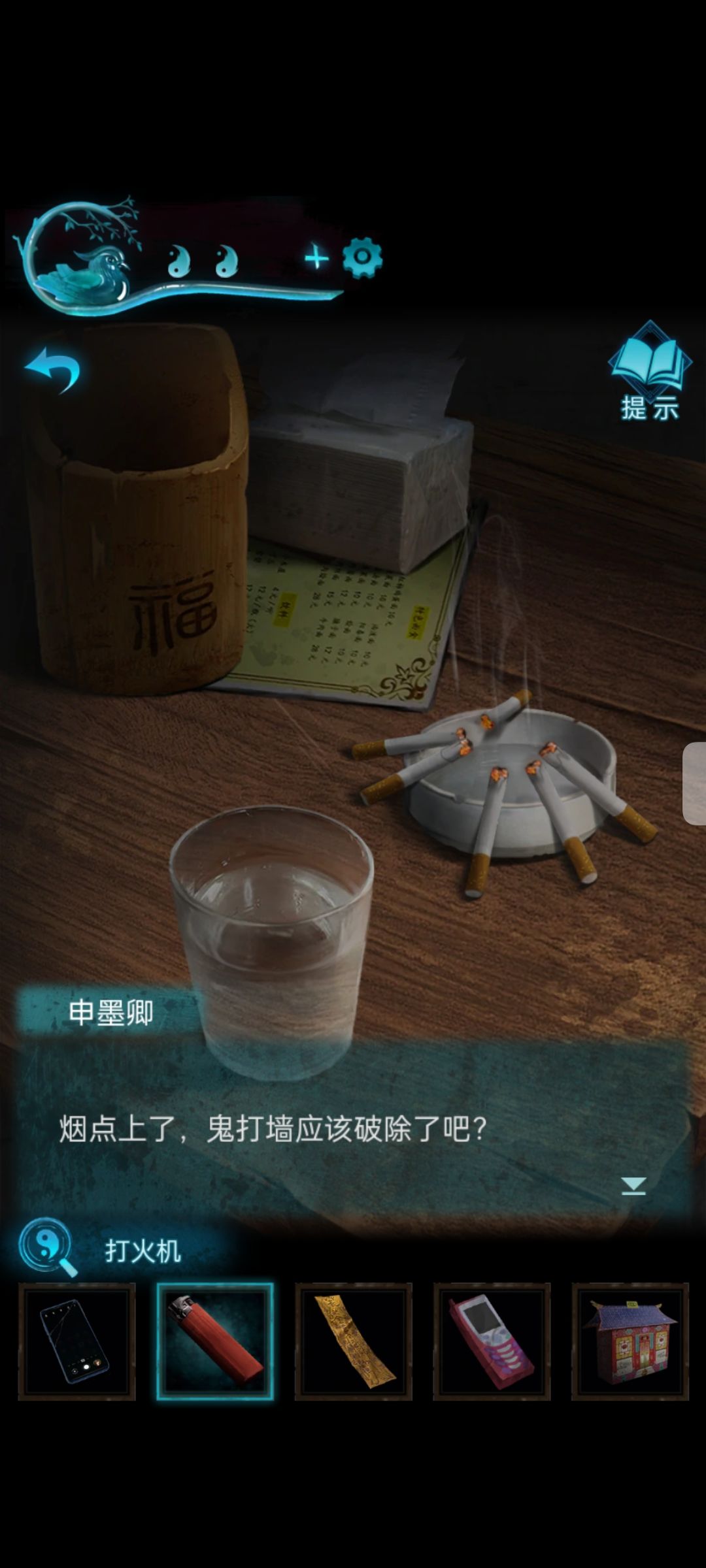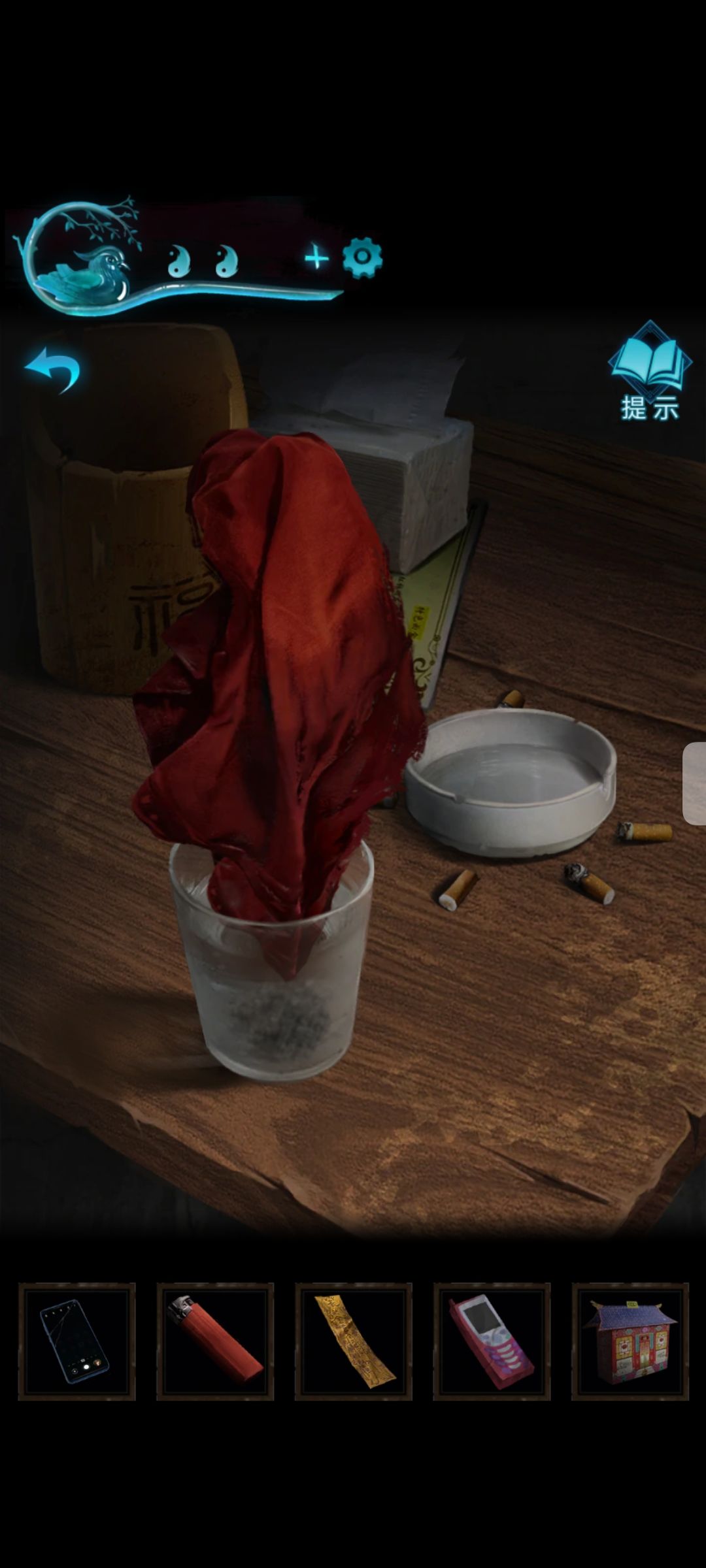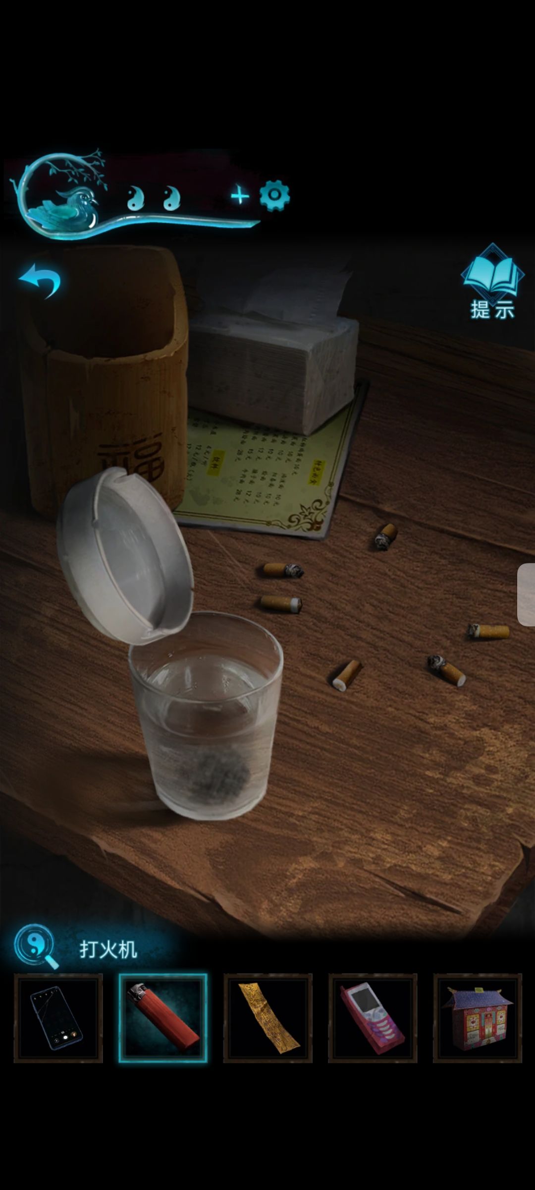 用盖头开坏掉的柜子,得喜烟,出去把烟放到烟灰缸上,点上,走完剧情再点烟灰缸,得到烟灰水,用盖头沾水,