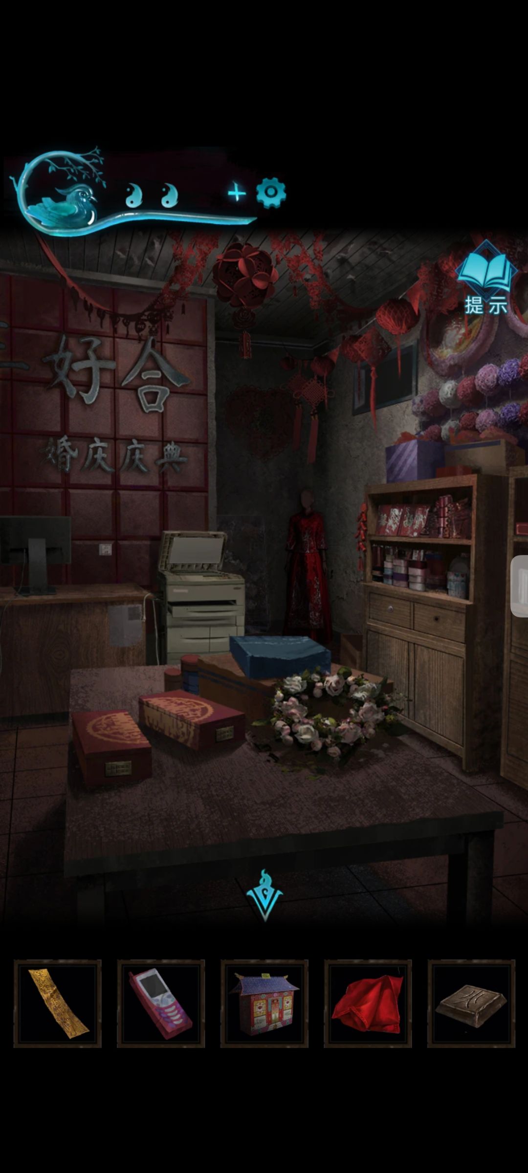走进旁边的屋子,先拿走桌子上的纸手机和纸屋,左侧上方打开书有提示,按照提示操作,打开柜子得到横幅见喜
