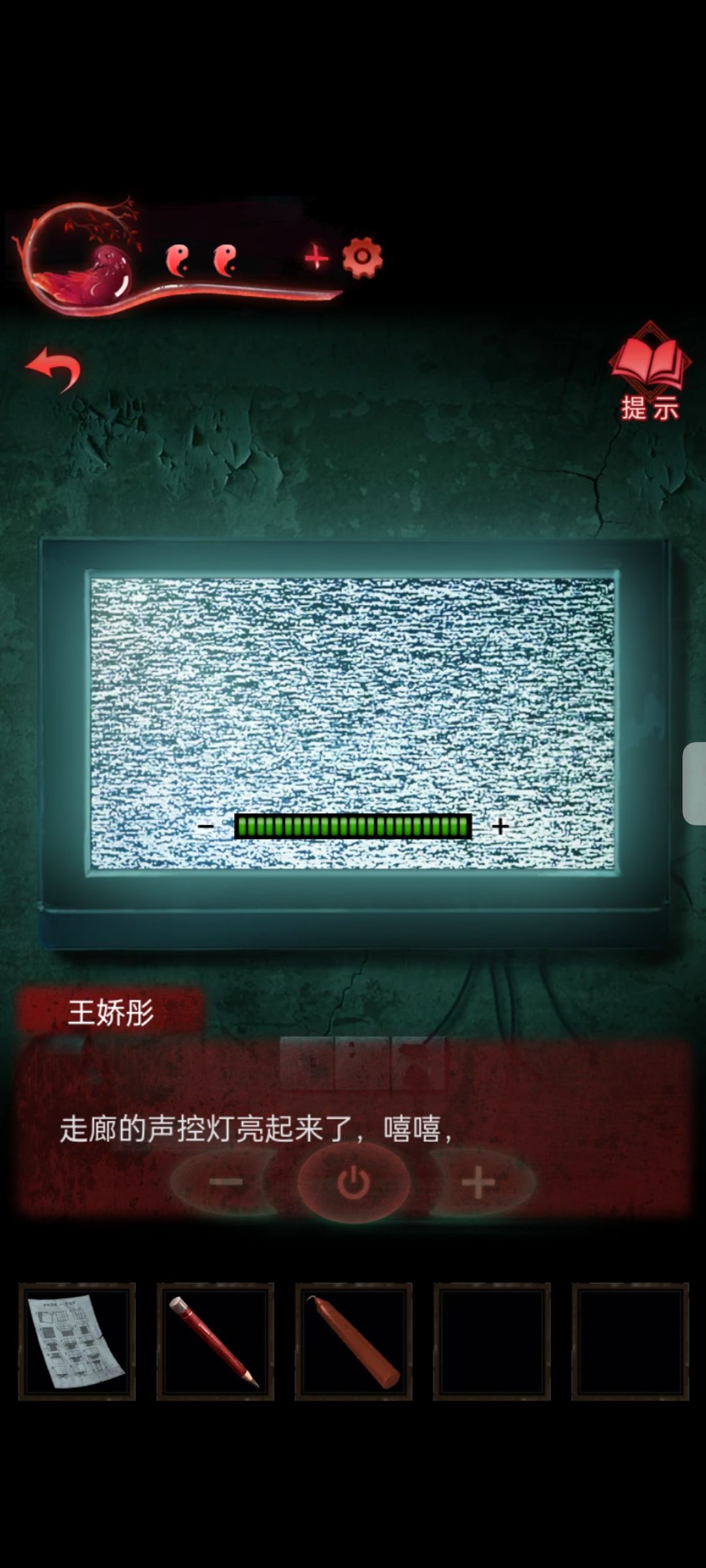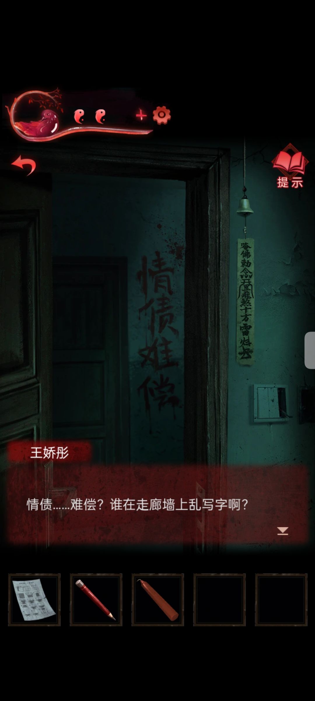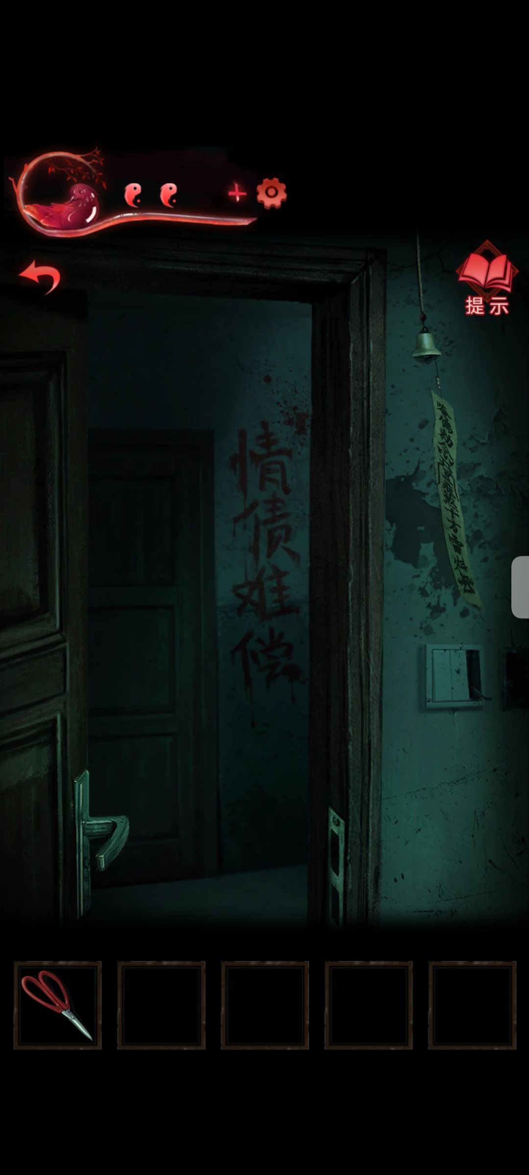 去外面开电视,开最大音量,看到楼道写着情债难偿,解开桌子上的盒子,得到纸剪刀。回厨房,把剪刀烧给自己。