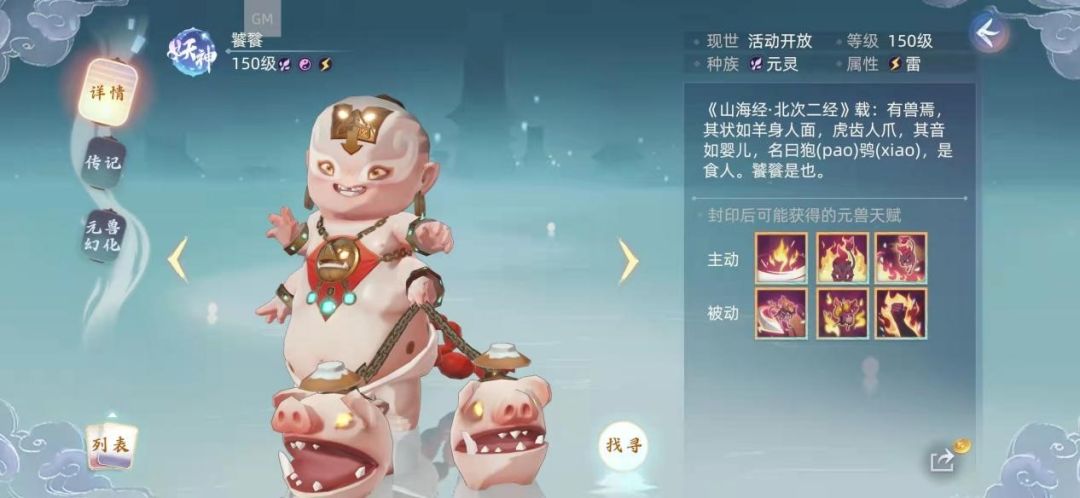 饕餮在游戏中究竟有什么技能,让他如此凶名在外呢?饕餮在游戏中是雷属性,因而技能也不例外和雷属性相关。技能雷击,可以对敌人造成雷击伤害,并同时附加眩晕状态,也是饕餮的先手技能。开局一个眩晕,谁能吃得消。除了眩晕状态,饕餮还可以通过技能阵风,对敌人造成高级缓速状态,技能电闪雷鸣则是一个群体技能,能对群体敌人连续造成5次攻击伤害。饕餮手中的猎猪,则能够够追猎敌人,收割直线方向血残的敌人。这一波连招下来,饕餮可能拿捏的妥妥~