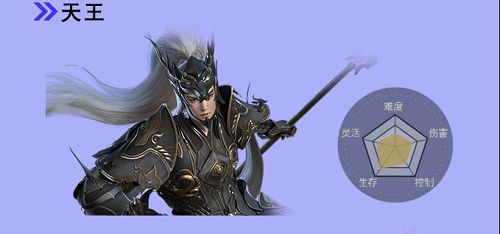 天王:主要作为一名近战长枪类的战坦角色,拥有着不俗的生存能力和攻击范围,技能,操作难度都是比较低的,在团战副本中充当着坦克前排的作用。