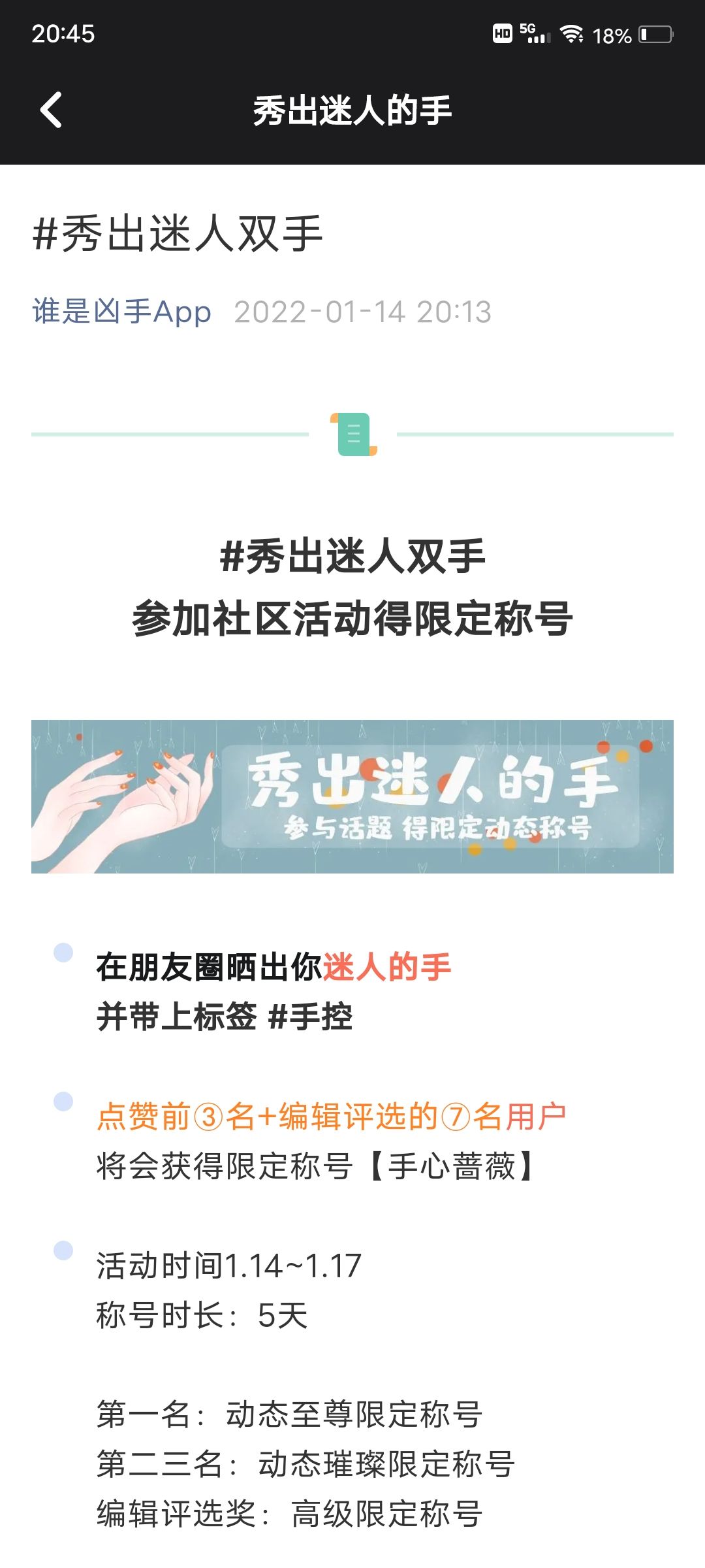 人帅不帅气好不好看没关系,但你必须得有一双美丽滴小手,秀出迷人的双手,在1.14日~1.17日之间参与“#手控”活动将有机会获得限定称号【手心蔷薇】,快来参加活动在动态里秀出你那与众不同的小手手吧😘