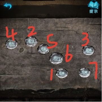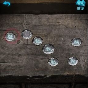 ③以女主身份,去场景一将无面雕像放到门上,打开门进入祠堂,切换男主。点击前面的案台,有七颗宝石可以点击。返回打开手机,发现殿内最上面有闪烁变化,顺序如图所示(以自己手机上的顺序为准),点完之后显示字样