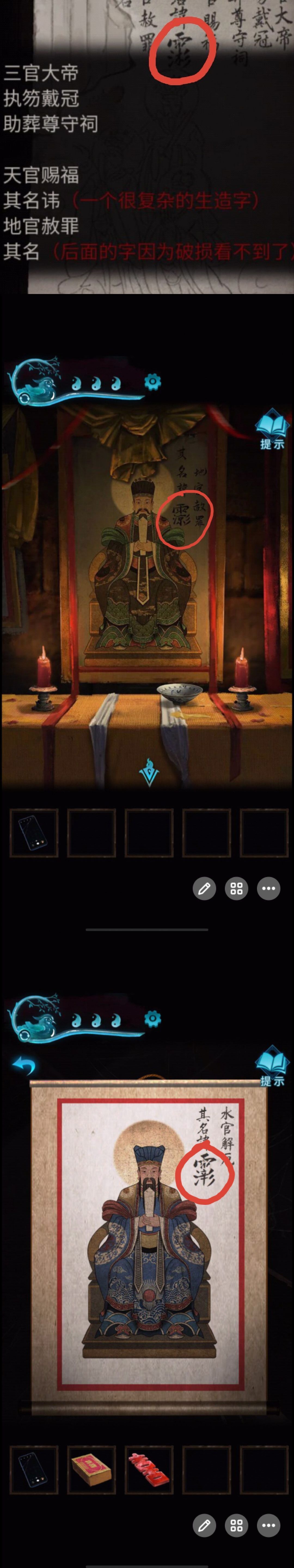 切换男主,回到六藏菩萨处,将拜神金纸塞入功德箱,获得:阳喜字 可窥得水官画像