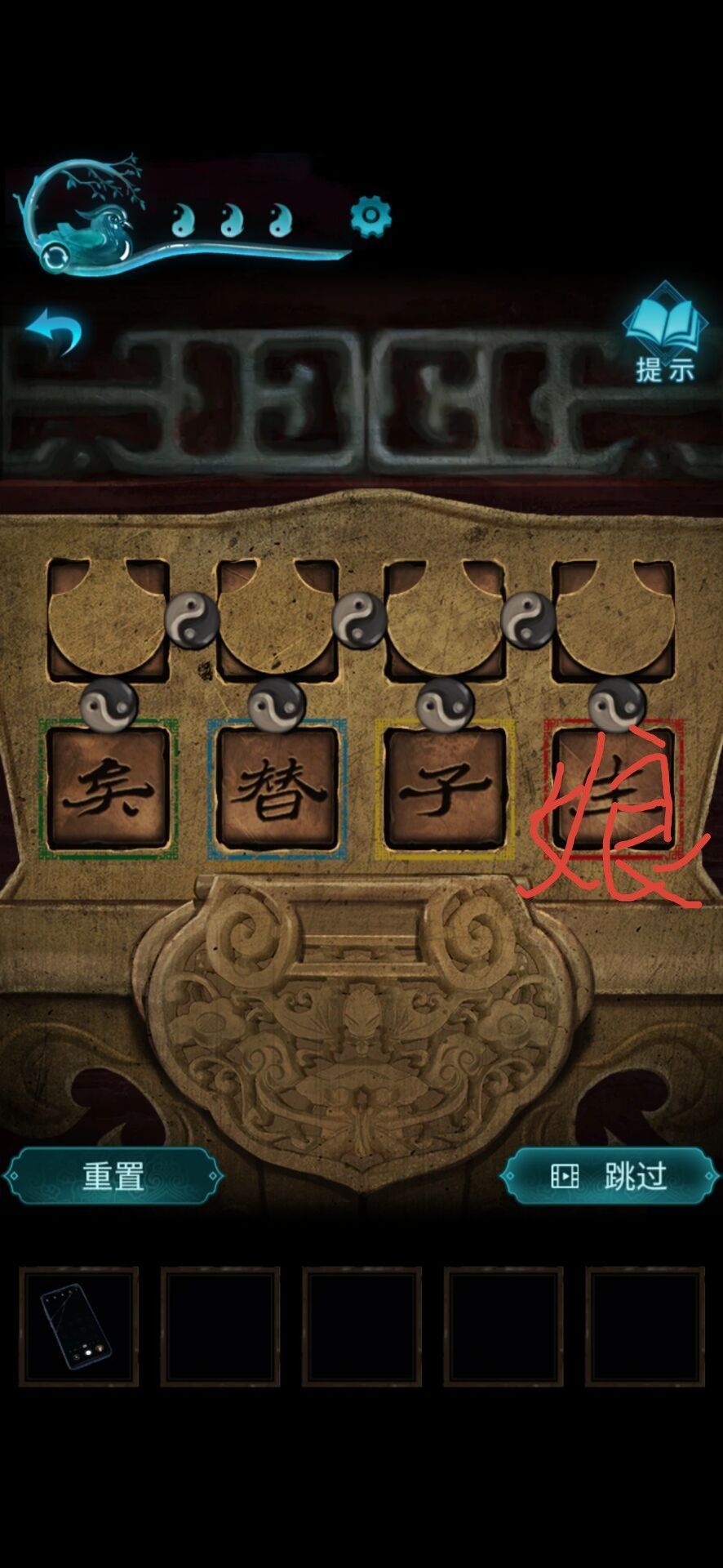 切换女主看碑文,进行象棋游戏(可跳过)每次行动必须吃子,双方剩将帅为胜。获得:阴喜字