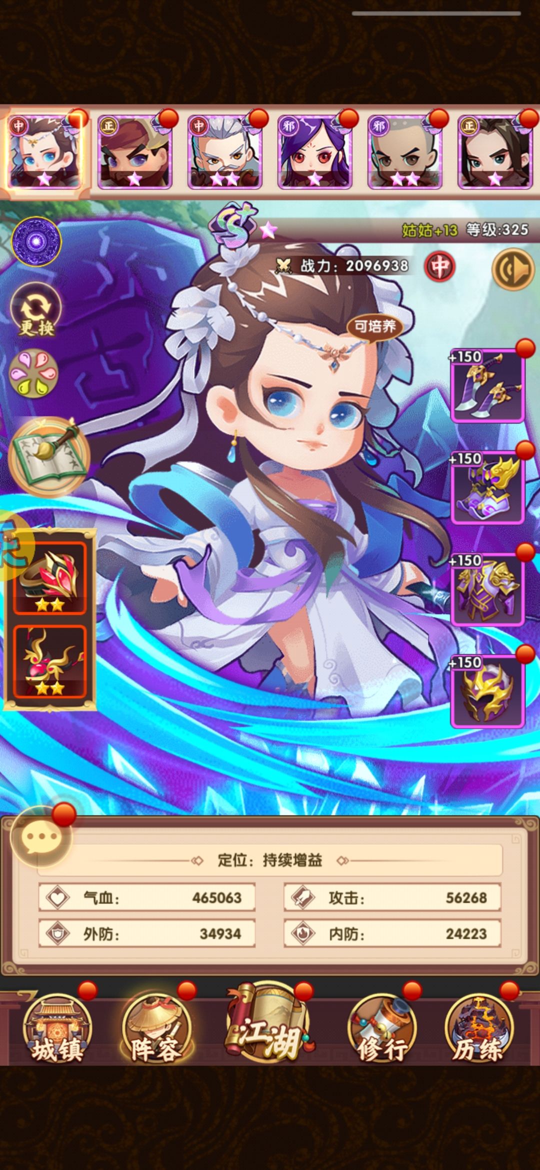 铁掌换了个攻击璇女,攻击快14万了,塔推到了1545,也过了两个神兽副本。除了boss用爆伤外,其他副本铁掌还是要用攻击的。