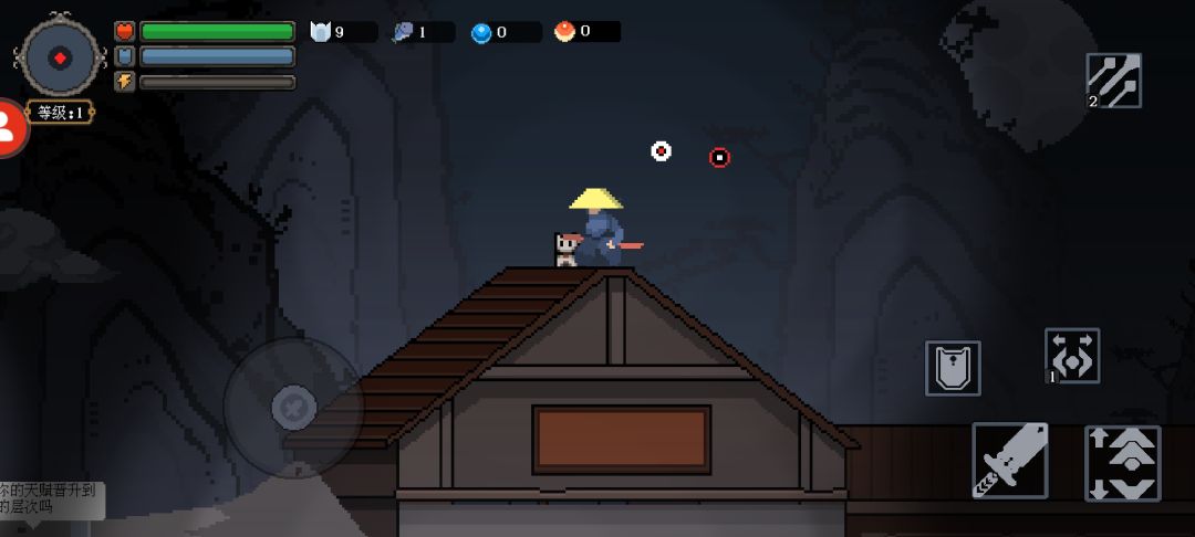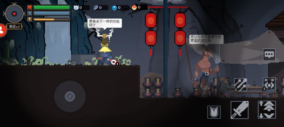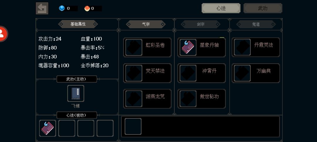 每次打通关和打开游戏的地方,左手位置应该是升级武功的,右手是升级天赋(需要点击对话)