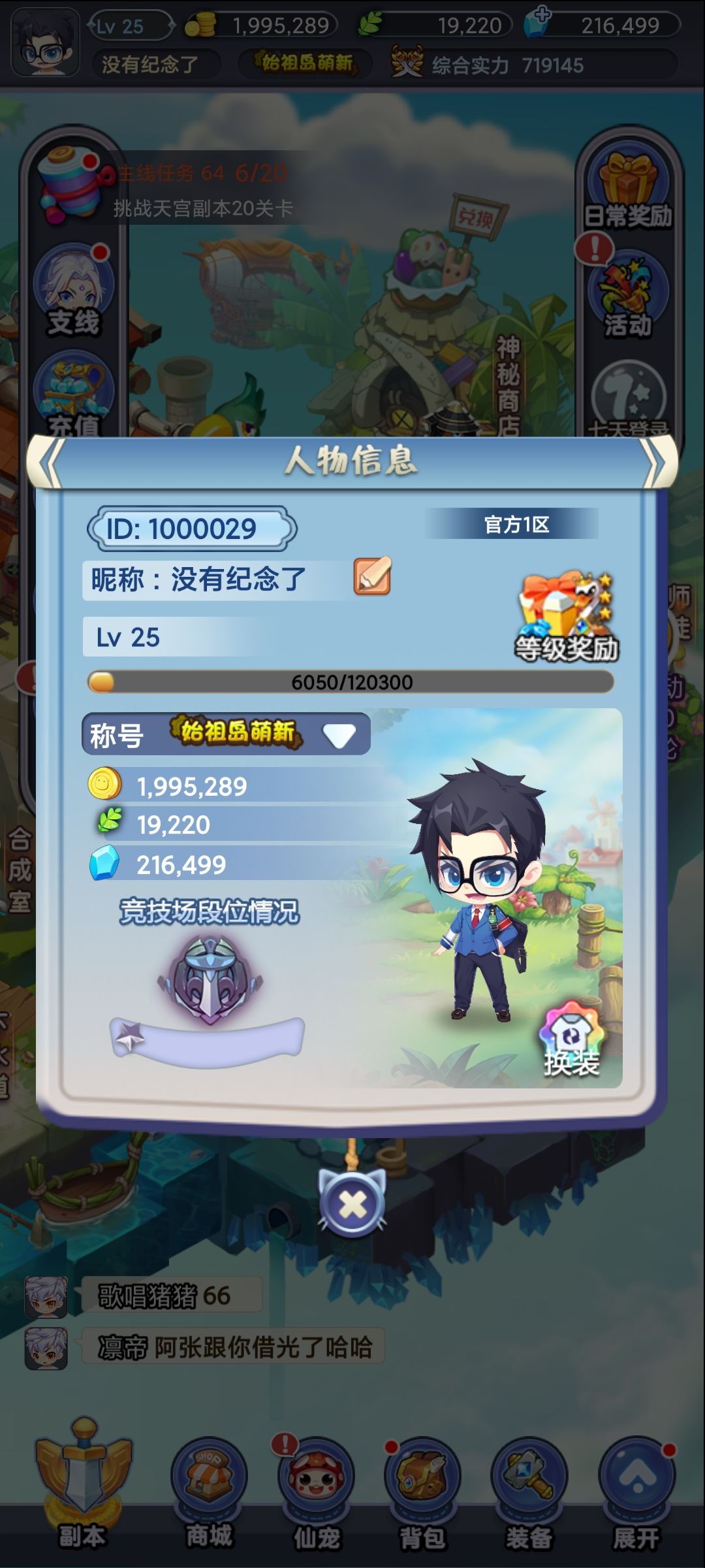 id是1000029,昵称:没有纪念了,欢迎到群里喊我,小氪1000,慢慢养成玩一下。平民一个月卡就好,常玩的三卡就够用了,不需要充太多,性价比不高,还没福利好。