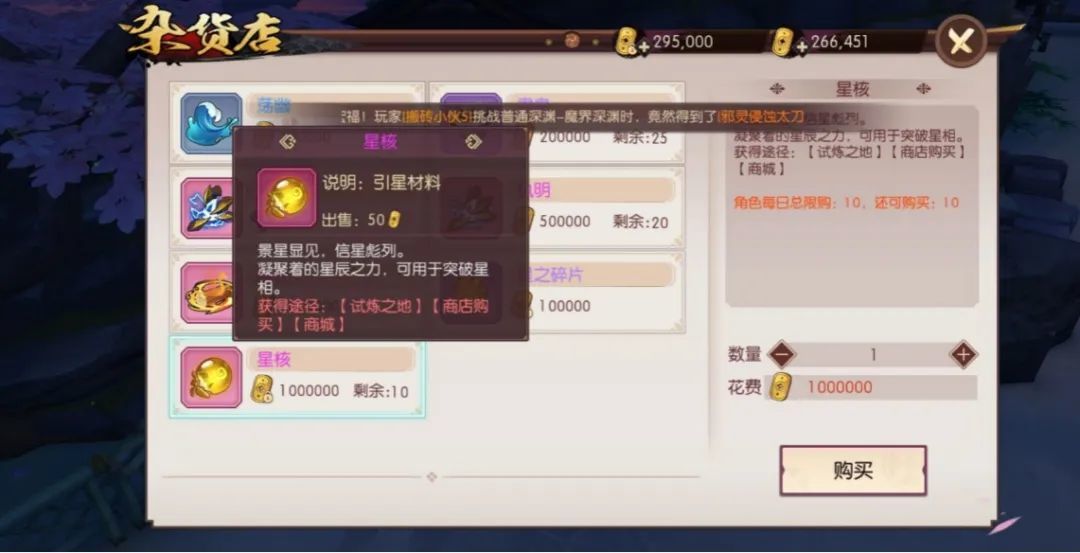 星核,是三种材料中获得方式最多的,所以尽可能不要使用金判购买。对于御魂满级,词条趋于完美的玩家,可以通过富余的试炼币兑换星核。前期升级星相消耗的星核数量少,只要平时正常完成试炼任务,产出和消耗基本是可以持平的,另外也可以多多逛逛交易行,比在娜可露露杂货店购买还是可以节约一些金判的。