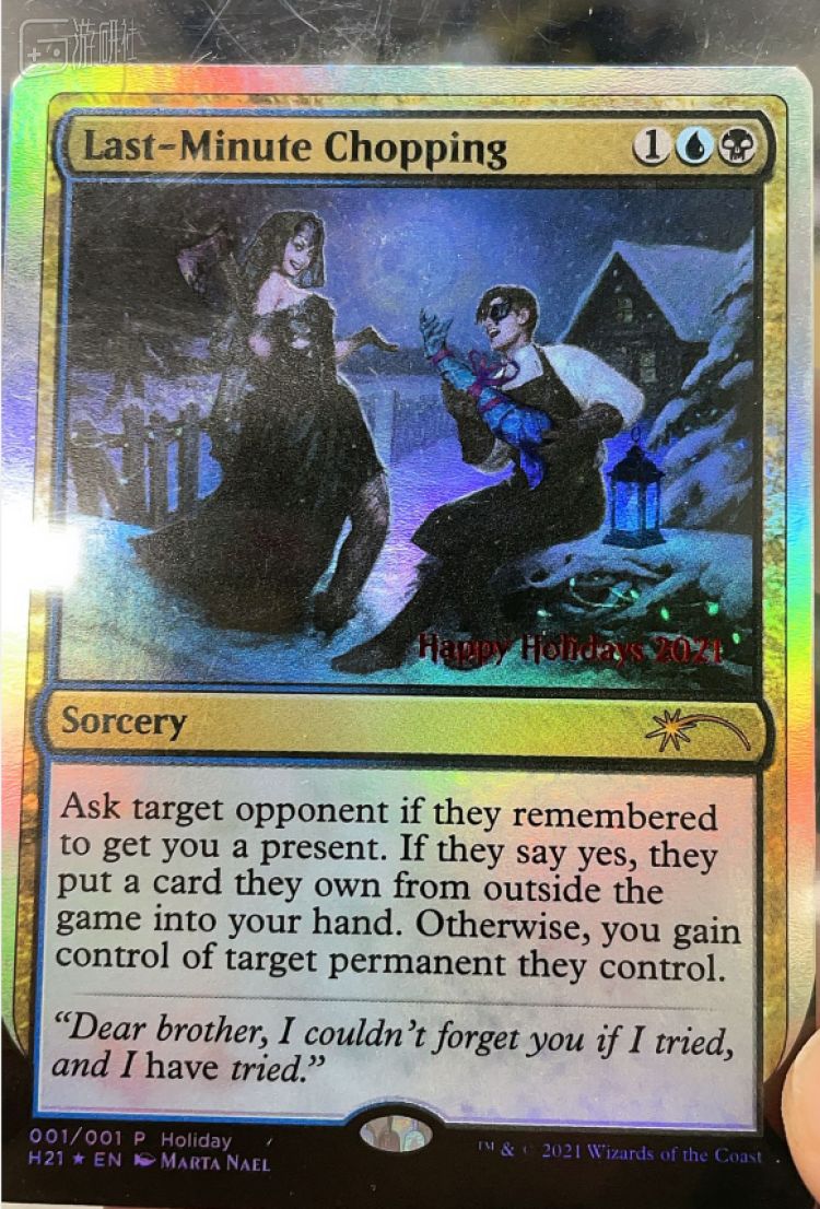 收到2021年万智牌圣诞纪念闪的那天,我恰好在读《阁楼上的疯女人》。牌中画着一袭黑裙的基沙,手持劈山斧,将灵俑的胳膊砍砍下,打上粉色缎带,送给她的弟弟基拉夫,欢庆这个属于黑色法术力的节日。我脑子里突然冒出一个句子:荒野里的疯女人。