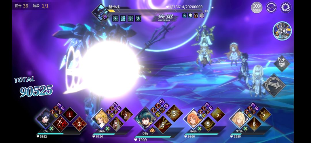 总共试了五次,boss大招是在最后一格血放的,所以保证雪拉减伤在最后一格血前面放出来,其他地方自动,总得来说光塔除了减伤80这个特点来说毫无特色