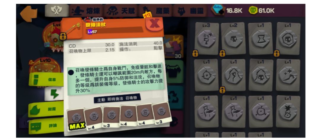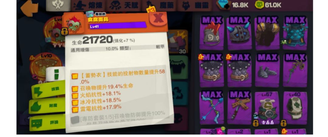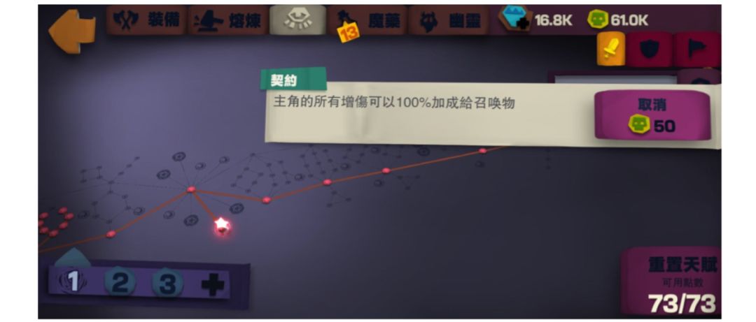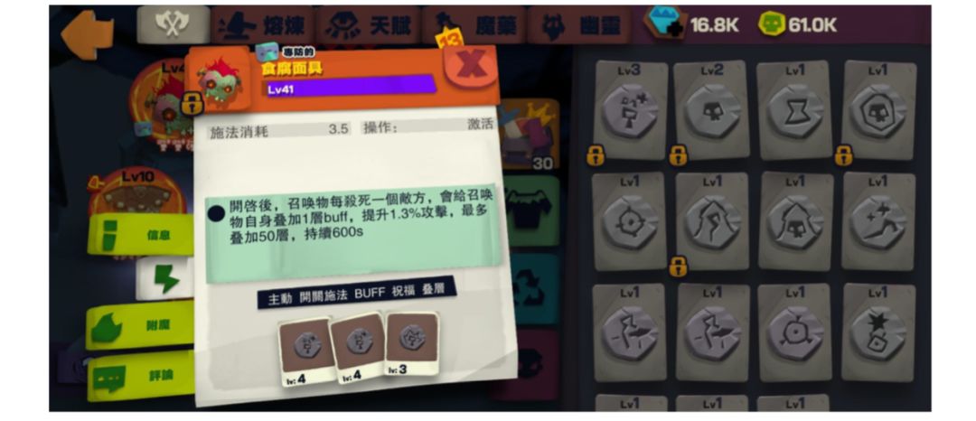 召喚上限(lv3)x3,多波次x1,召喚物攻擊x2 這配置可以有4隻聚合4的發條,如果全部都叠滿食腐的話4隻同時揮拳傷害比較可觀。這配置 同時能發動另一型態,就是血量最高的型態。只要改一點天賦發動了+100%HP的“獨立”,就能 夠享有神高血量和幽靈部門的減傷