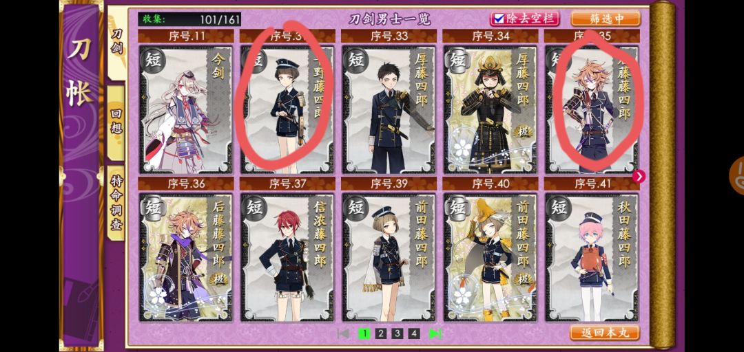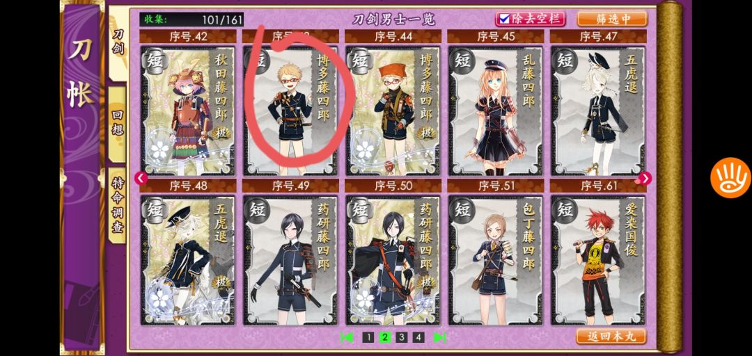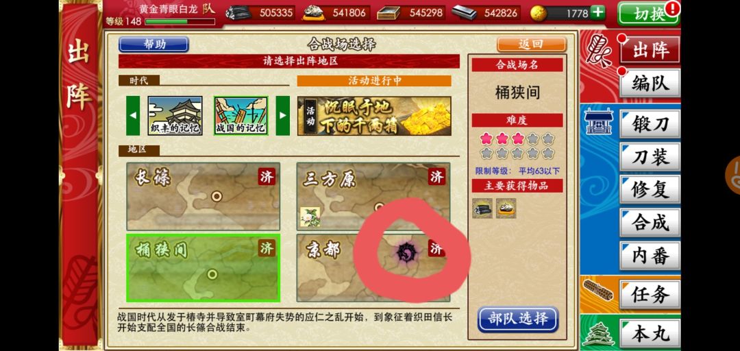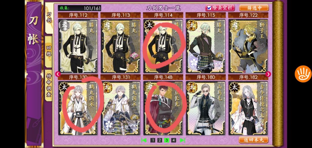 3、在练级的同时,组好一队短刀做远征升级,过图能捞到的短刀就行,尽量选生存高的。如果锻造出下面画圈的刀就更好了。