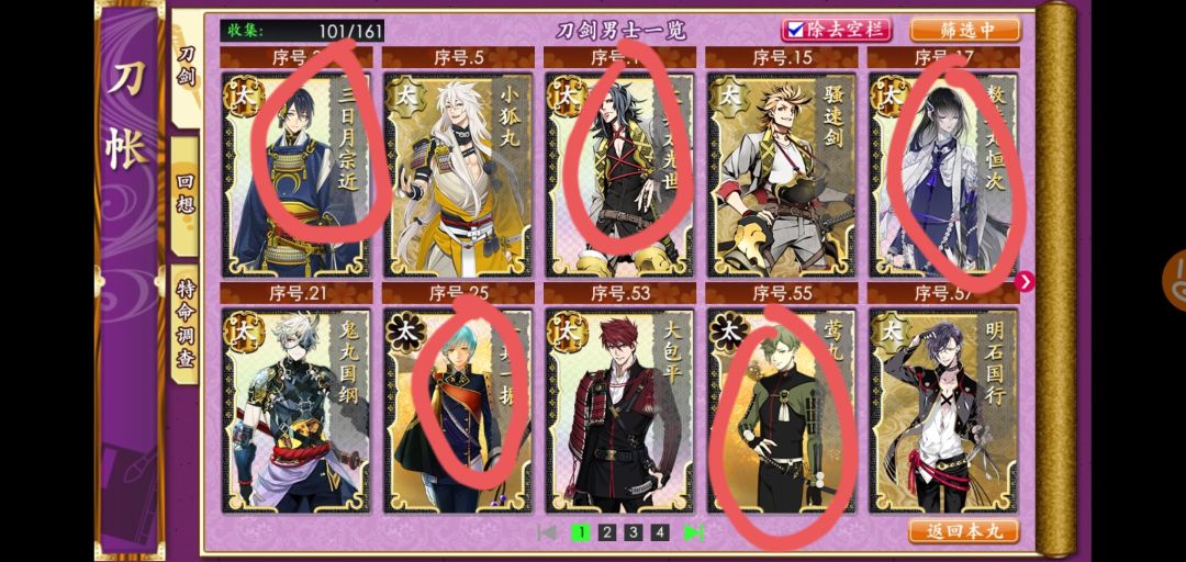 也不要把资源全浪光,留几千资源做刀装。最理想的情况下,你能锻出一队太刀,但不是什么太刀都能用来过8图。下面我画圈的是萌新能锻出来的靠谱的太刀。