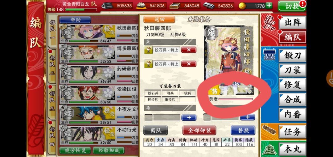 2、用轮换队长和单刀出阵1—1的方法控制刀的心情,黄脸红脸的刀容易受伤。想要肝个不停就必须把没心情的刀带到1—1去打几圈。心情在这里看。