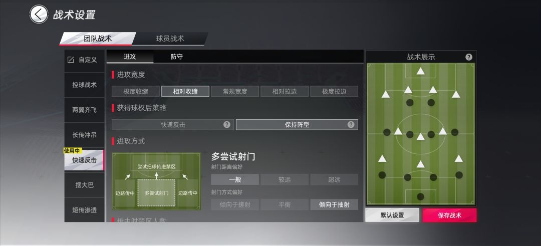 首先,在传球和带球里选择倾向传球传输方式点地面,直塞点平衡,突破点传球找机会,点上保持阵型,进攻宽度点到相对紧缩或者平衡宽度。