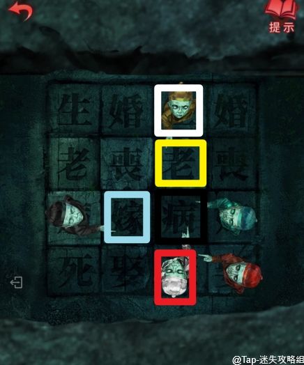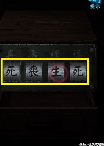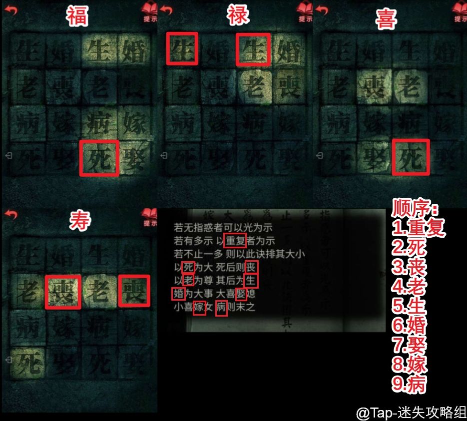 101.观察地板上的图案,得到密码线索(此处需要男主视角在上面切换“福禄寿喜”的地板,女主在地下观察地面灯光照到的文字变化,记住每个字对应的图案,根据《寿祭》中记载选择每个图对应的字,如图101):福-死、禄-生、喜-死、寿-丧。101