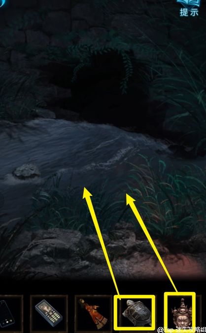 104.回到宗祠门口,点击左边的河,将【石龟】和【佛头】都扔入河中,然后返回宗祠。104 104.1