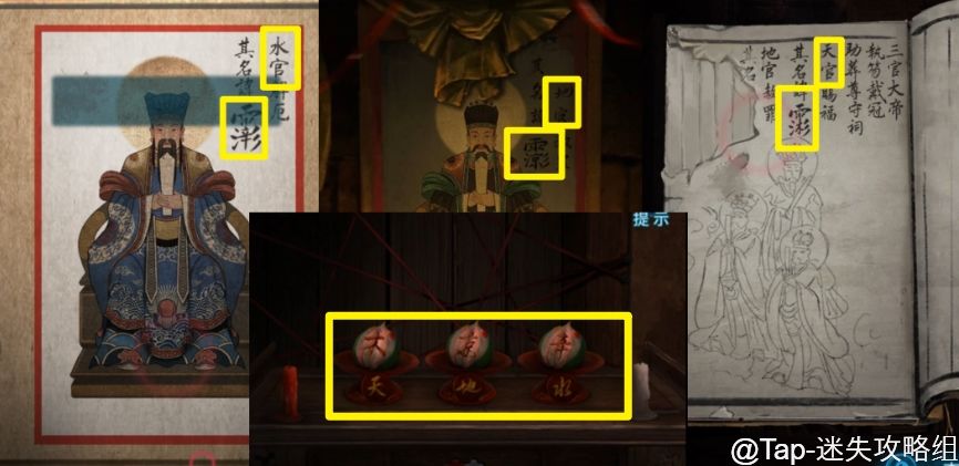 118.根据之前得到的线索(《名讳秘字》中天官名讳含“木”,地宫中画像显示地官名讳含“京”,寺庙功德箱中画像显示水官名字含“辛”),将寿桃上的字改为:天-木、地-京、水-辛(男主和女主视角的寿桃字都要)。117