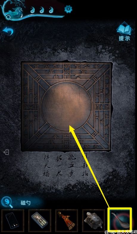 96.回到野外小道,点击发现【石龟】的石盘,将【磁勺】放上去。96 96.1