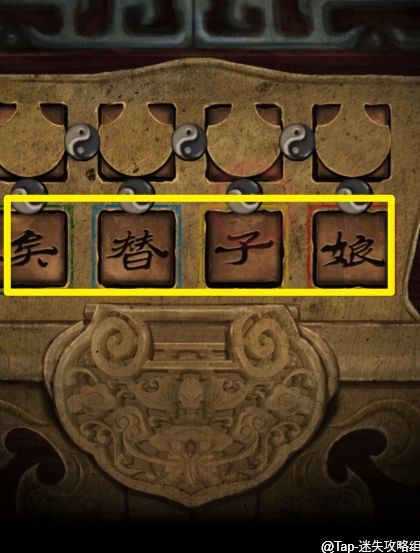 120.来到宗祠门口,点击门口的箱子,按照上面的线索,将不同颜色的框框内改成对应的字(小游戏难度不高,每个框中有两个字,上面一排的阴阳按键可以调整相邻两个框中后面的字,下面一排阴阳按键可以调整同一个框中前后两个字)。120 120.1