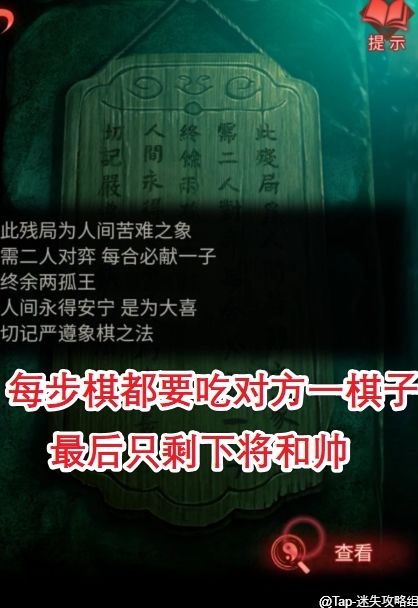 107.查看牌子上的下棋规则(黑棋拱卒吃马,红棋回士吃車,黑棋走马吃士,红棋移車吃马,黑棋拱卒吃車,红棋走帅吃马,黑棋动将吃兵,红棋走帅吃卒,最终只剩下将和帅)(只是个小游戏不是真的下棋,只有每步都吃对方一子,最后剩下将和帅就行)。107 107.1
