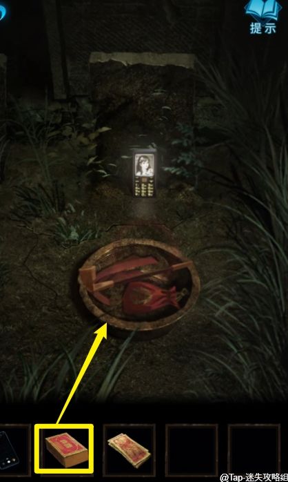 112.将左边的火盆拉过来,石碑前放上【老年机】,火盆中放入【纸扎烟袋】,用【火柴】点燃。112