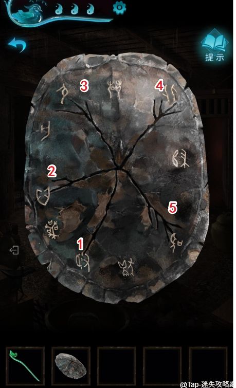 20.将【龟壳】扔进火盆中,用【火钳】将龟壳拿出,将龟壳上的裂纹对应的暗号记录,一条裂纹为1,两条裂纹为2如图。20 20.1