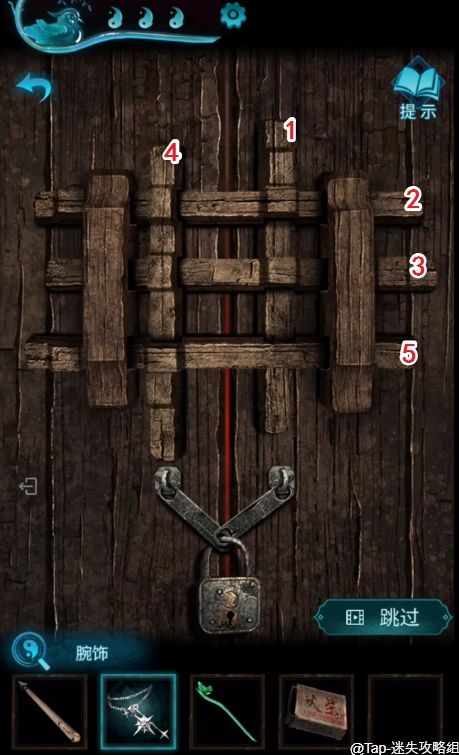21.返回石洞下屋子,控制指针先转到裂纹数为1的暗号,再转到裂纹数为2的暗号,按照裂纹条数依次转动,根据罗盘上文字推理,第1次转动为顺时针,第二次为逆时针,依次类推,1、3、5为顺时针,2、4为逆时针,打开柜子拿到托架。21