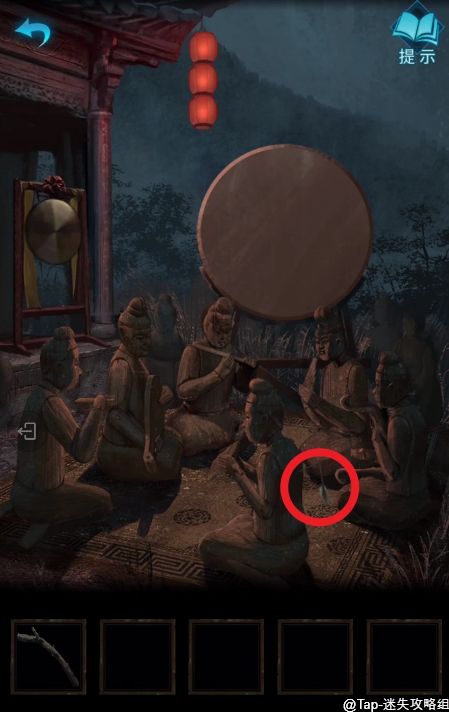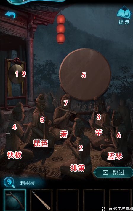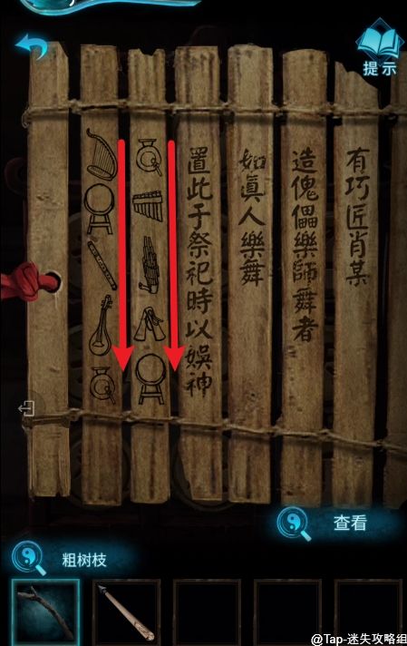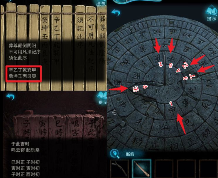 3.点击场景中间的架子,根据门口牌子上的内容与崖顶日晷的提示推理出架子上敲锣顺序(巳时正日晷上的刻度对应的是甲,子时初对应庚,则推算出敲锣顺序为【甲庚丁乙辛壬】),用粗树枝敲响锣。3 3.1