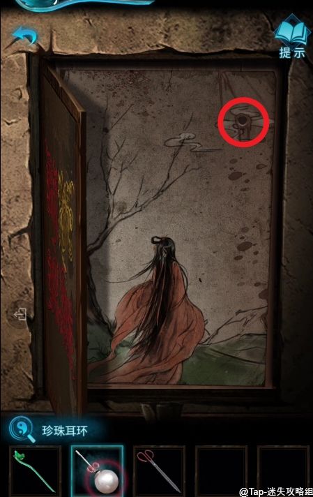 17.返回石洞处,用【小箱子】将石门顶住,进入屋内,将【金箔花】贴在窗户,窗户打开,将【珍珠耳环】放置在壁画右上方圆孔内。17 17.1